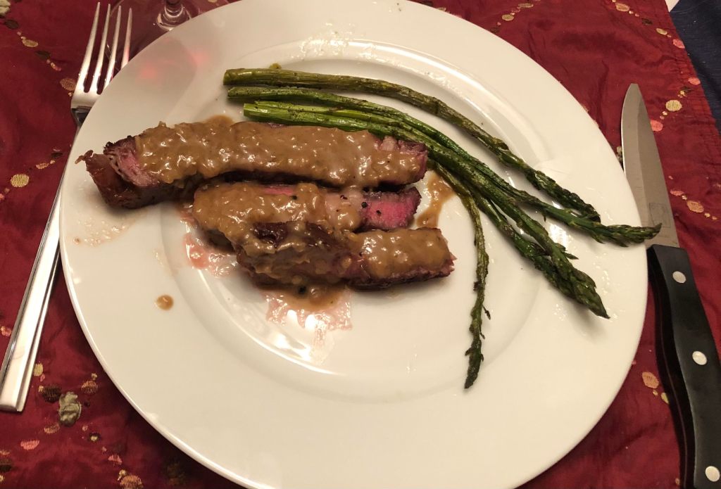 Happy New Year everyone! As I mentioned in a previous post, what a year 2020 has been. One thing that has made this year manageable was getting a better kitchen and exploring the world of food and wine right from our home. Typically on New Year’s Eve, we would be out with friends and family ringing in the new year but of course this year is a bit different. We decided not to let the change in pace stop us from having an amazing quiet night and why not have great steak too? To ring in the new year, we decided to make Steak au Poivre with Brandied Cream Sauce and roasted asparagus. We followed the Cook’s Illustrated recipe but made a slight variation due to using a 32 oz dry-aged ribeye steak from Snake River Farms instead of 4 strip steaks. While we cannot go out and see fireworks this year, this steak truly makes being stuck in quarantine just a little better. We outlined how we made it below!
