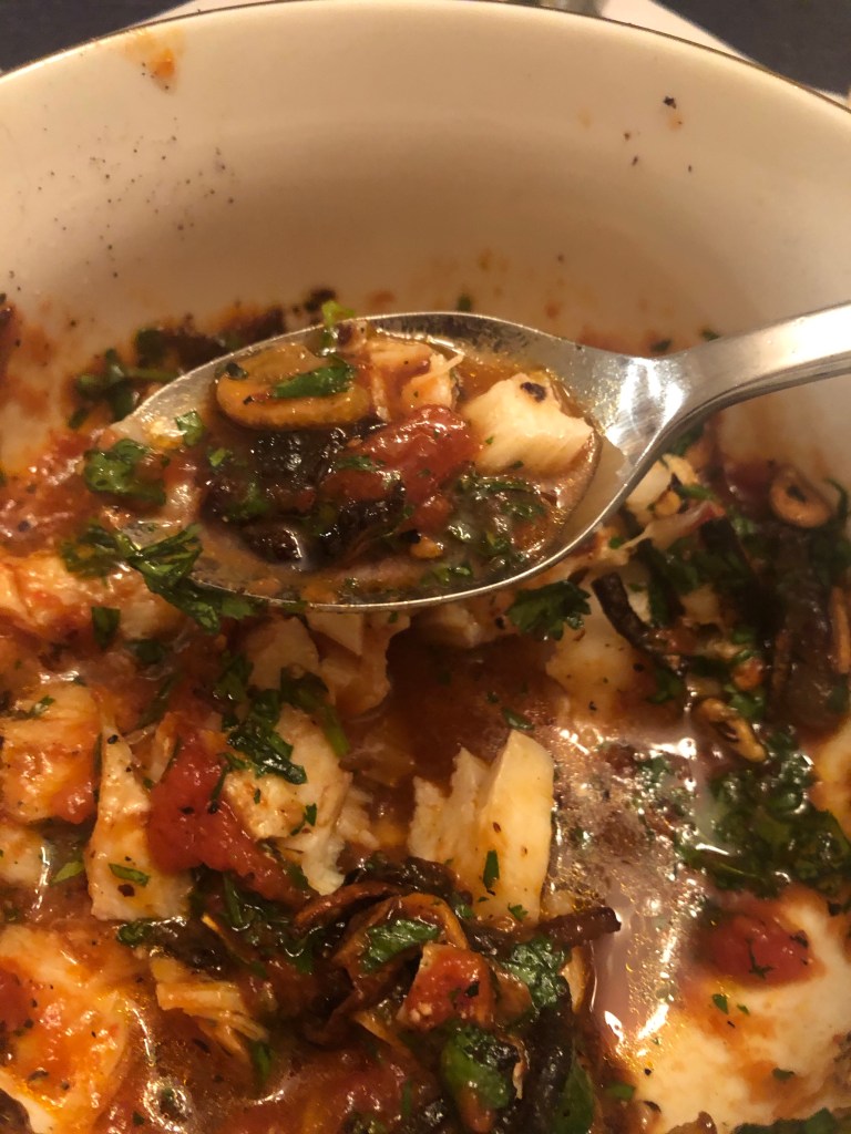 Alison Roman Tomato-Fish marries light cuisine with crispy, spicy toppings. Whenever we make this dish it always is covered in cilantro and hot sauce. However depending on someone’s heat tolerance, one can make this as spicy or mild as they’d like. Hope you enjoy reading!
