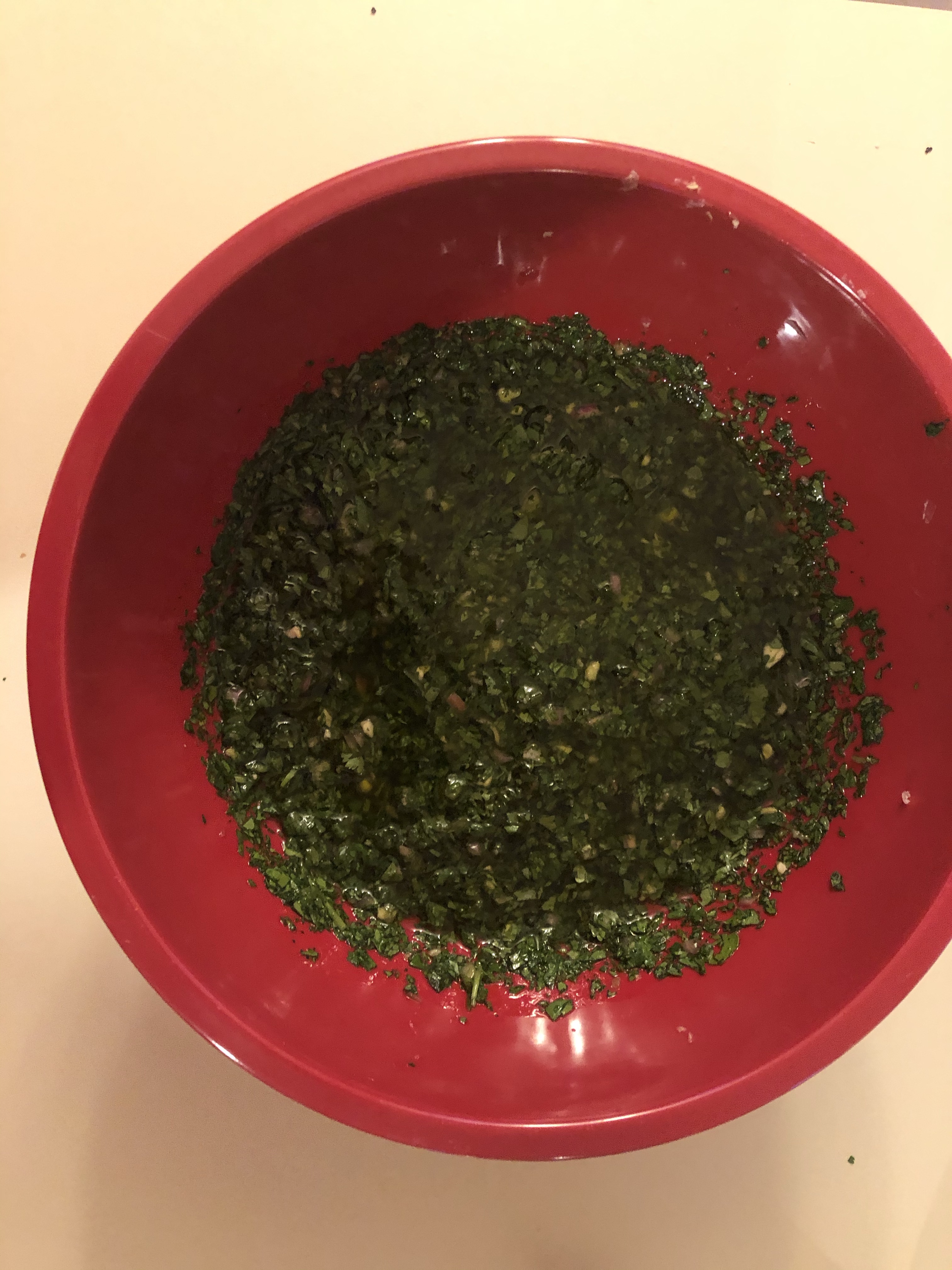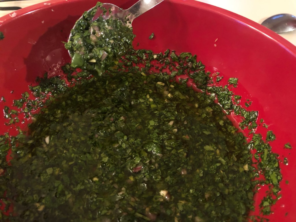 Meanwhile, take the medium bowl with chimichuri. Stir in cilantro, parsley, and oregano. Using a fork, whisk in oil.