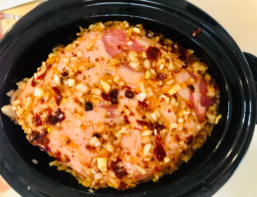 3. In a slow cooker, pour in half of the mixture and coat the bottom. Place the salted pork butt into the slow cooker, fat side up, and add the remaining mixture on top. Spread the mixture around the top and try to get some of the mixture onto the sides of the pork butt.