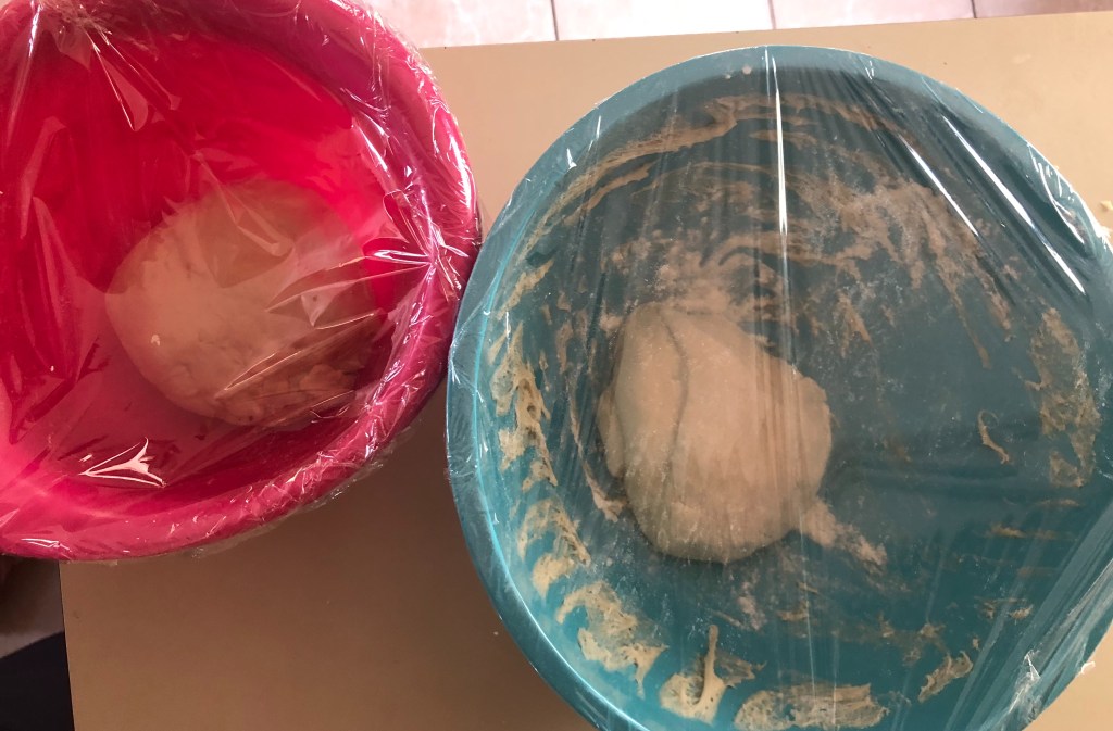 When the dough has roughly doubled in size, divide it into 3 or 4 equal pieces, depending on what size you want your pizzas to be (either 12 inches or 16 inches wide). Place each piece of dough in a separate bowl or tray, cover with cling film and leave to rise for another 30 – 60 minutes, or until doubled in size.