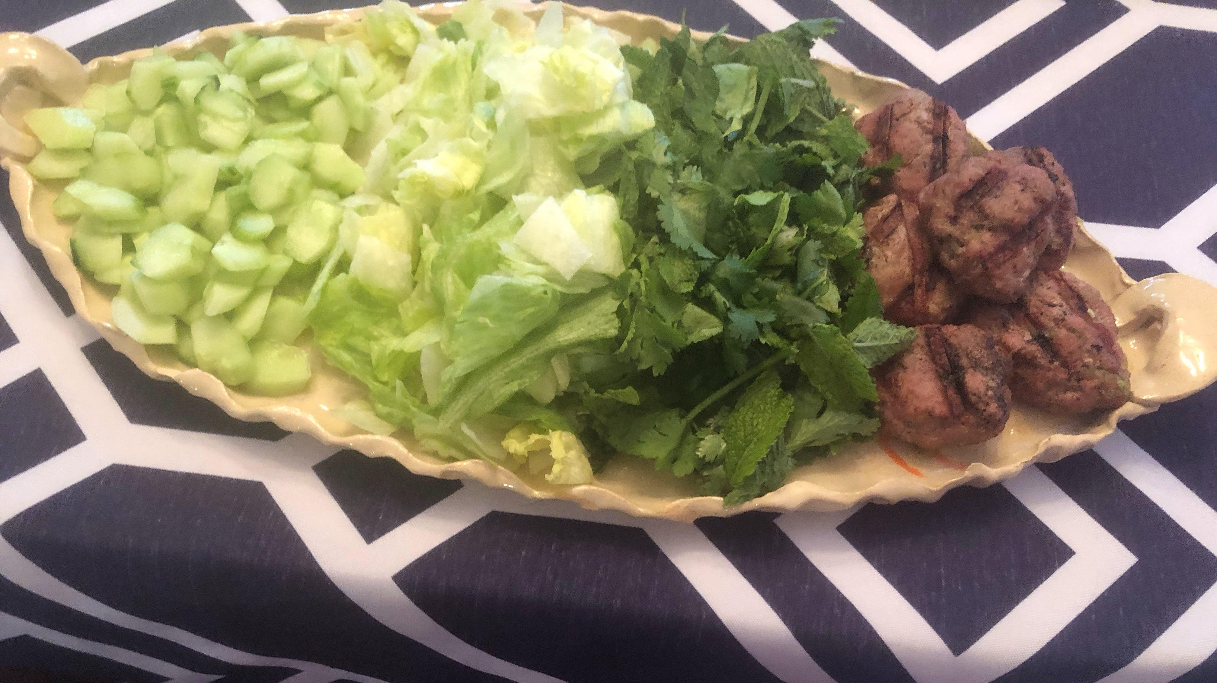 - FOR THE NOODLES AND SALAD: Bring 4 quarts water to boil in large pot. Stir in noodles and cook until tender but not mushy, about 4 to 8 minutes. Drain noodles and rinse under cold running water until cool. Drain noodles very well, spread on large plate, and let stand at room temperature to dry. Arrange lettuce, cucumber, cilantro, and mint separately on large platter and refrigerate until needed.