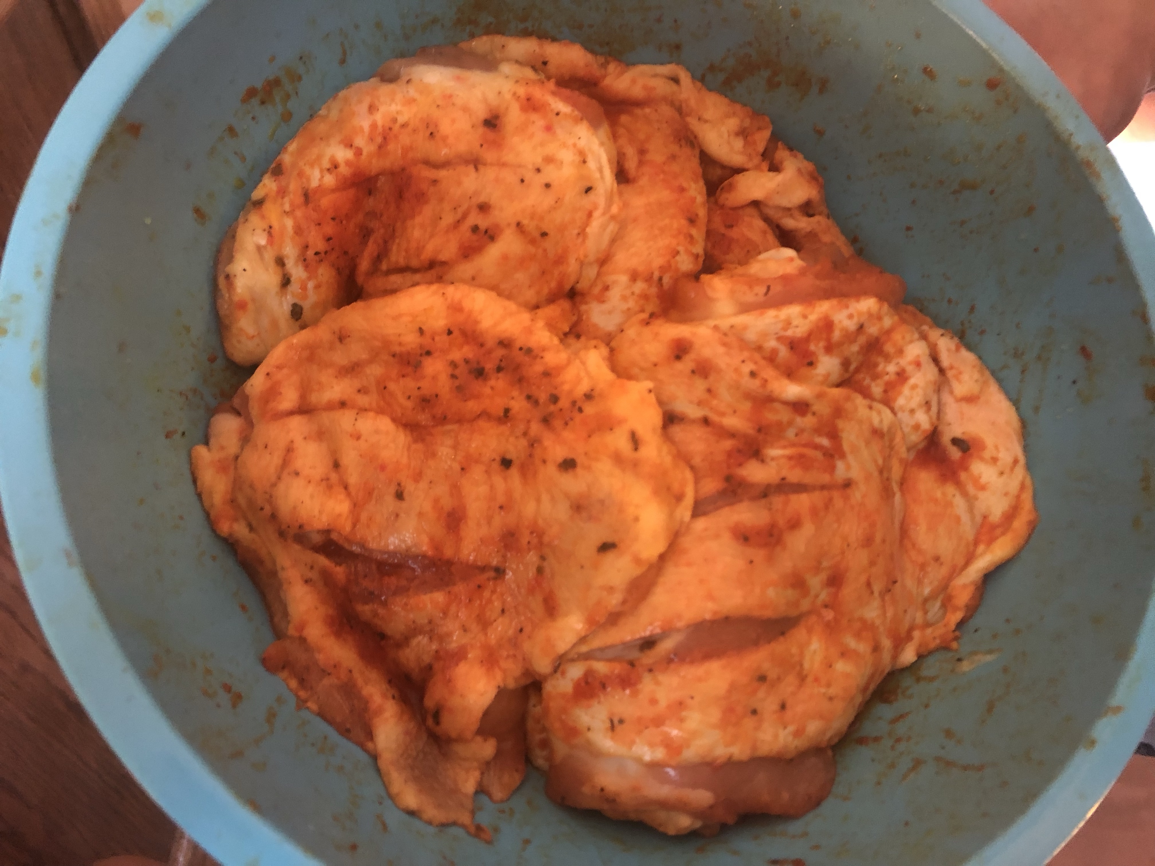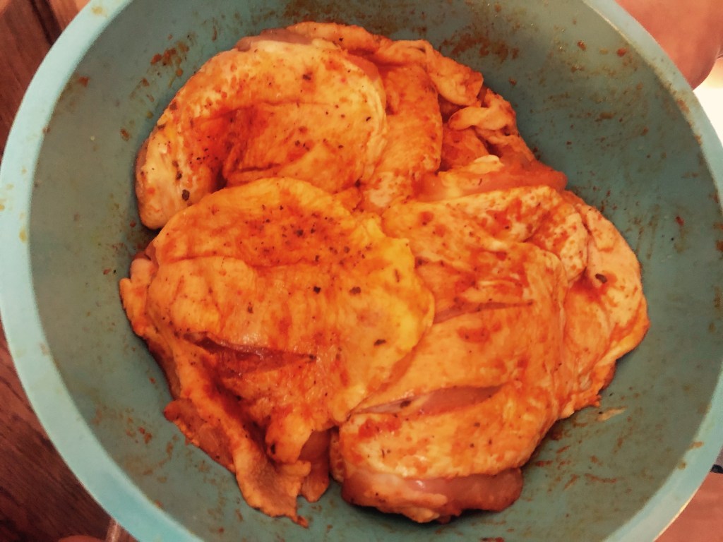 For Chicken Thighs: Slash through the skin, down to the bone, in 1-2 places on each thigh. Proceed to step 3.